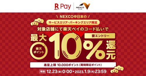 楽天ペイメントは、スマホ決済サービス「楽天ペイ」アプリにおいて、中日本エクシスが運営管理をする「NEXCO中日本」管内のサービスエリア(SA)・パーキングエリア(PA)にて、「NEXCO中日本でのお買い物で最大10%還元キャンペーン!」を12月23日から2023年1月9日まで実施することを発表した。
