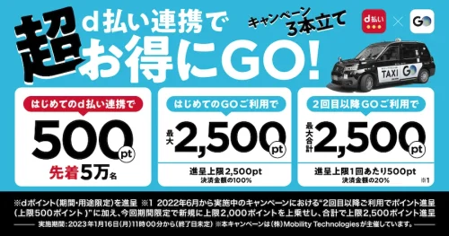 『GO』の決済手段に『d払い』を初めて設定したユーザー、先着50000名にdポイント(期間・用途限定)を500ポイントプレゼントする。さらに、『d払い』を設定した『GO Pay』の初回利用で決済金額の100%分(上限2500ポイント)、2回目以降の利用では何度でも最大20%分(1回あたり上限500ポイント、合計上限2500ポイント)のdポイント(期間・用途限定)が還元されるとのこと。『GO』によるタクシー注文はもちろん、道や乗り場など流しでの『GO Pay』利用も対象となるとのことだ。