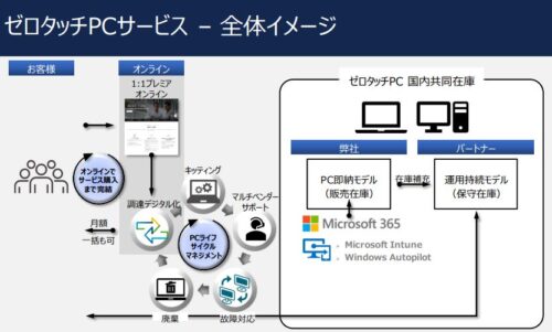 この課題に対応するため、同社では、「ゼロタッチPC for SMB」のサービスを開始する。このサービスのターゲットとなるユーザーは、情シス担当者1人以下の割合が高く、PC購入・運用に関する業務負荷の高い国内中堅中小企業となる。このサービスは、「運用管理のマニュアル対応ゼロ」、「PCの初期セットアップゼロ」、「故障したときの障害対応ゼロ」という3つの「ゼロ」で、情シス担当者の運用負荷を軽減するものである。