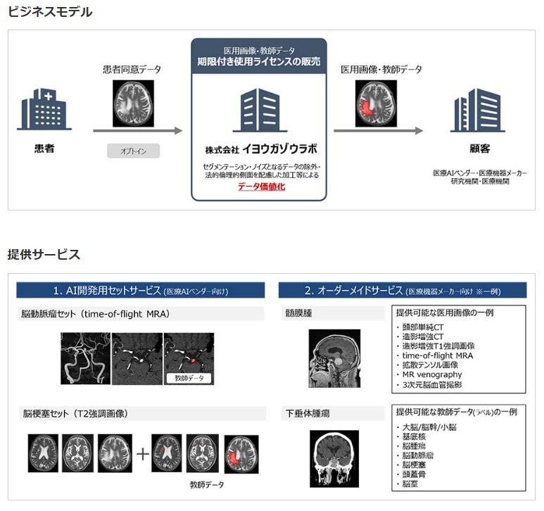 イヨウガゾウラボは、この「データ流通のボトルネック」を解消するためのソリューションを提供する。そのビジネスモデルは、「収集」「加工」「提供」という3つのステップで構成されている。まず「収集」の段階では、協力関係にある病院や医師との独自のネットワークを活用し、研究開発へのデータ利用について患者から適切に同意(インフォームド・コンセント)を取得した上で、CTやMRIなどの医用画像データを安全に集める。次に最も重要な「加工」の段階では、収集した生データに様々な処理を施し、価値の高いデータセットへと昇華させる。その中核となるのが、医師の監修のもとで行われる高品質なアノテーション作業による教師データの構築だ。加えて、AIがノイズなどから誤った特徴を学習してしまうことを防ぐためのデータクレンジングや、個人情報保護に万全を期すための匿名化処理も徹底する。特に匿名化においては、東京大学が研究を進めてきた先端技術を活用し、個人の特定に繋がりうる顔の部分を精巧に変形させたり、画像に付随するタグ情報から個人情報を削除したりといった高度な処理が行われる。最終的な「提供」の段階では、こうして磨き上げられた高品質な医用画像データと教師データのセットを、期限付きの使用権(ライセンス)という形で、医療AIベンダーや医療機器メーカー、大学などの研究機関へ提供する。サービスは、脳動脈瘤や脳梗塞といった特定の疾患に対応したデータセットをパッケージで提供する「AI開発用セットサービス」と、顧客の個別の要望に応じてデータセットを構築する「オーダーメイドサービス」の二本立てで展開されるそうだ。