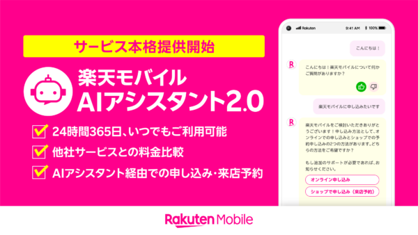 楽天モバイルは、12月18日より、生成AIを活用したチャット形式のサポートサービス「楽天モバイルAIアシスタント2.0」の本格提供を開始した。「楽天モバイルAIアシスタント2.0」では、楽天モバイルに関する質問への回答のみならず、チャット内で「楽天モバイルショップ」の来店予約および「Rakuten最強プラン」の新規契約なども24時間365日可能となっている。