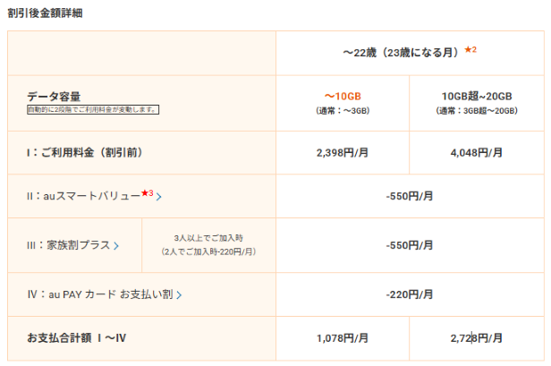 割引対象は、18歳以下の契約者または利用者に加え、同一の「家族セット割」グループに属する家族も含まれる。自宅セット割、au PAY カードお支払い割との併用などを最大適用した場合、30GB利用時でも1年間は月額1,078円(税込)で利用できる計算となる。13カ月目以降も各種割引は継続され、、30GBまでは月額2,728円(税込)となる
