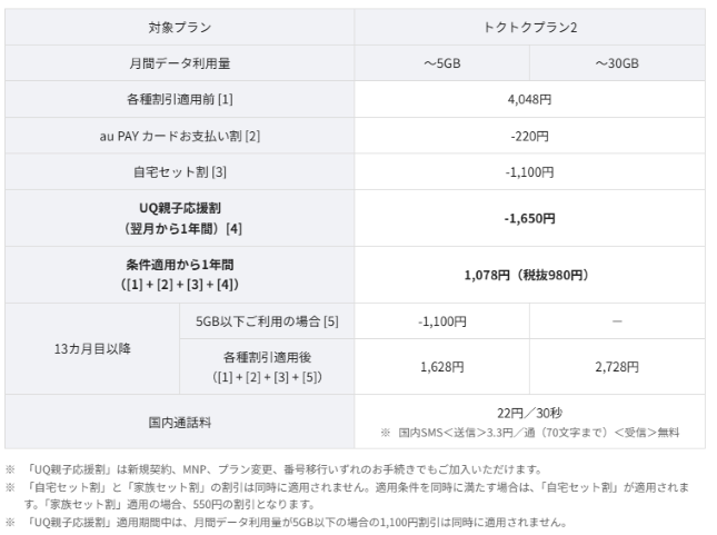 「UQ親子応援割」は、18歳以下の利用者とその家族を対象に、対象プランの利用料金を12カ月間割り引くキャンペーンだ。対象となる「トクトクプラン2」は、月間30GBまで利用できる大容量プランで、30GBまで利用時の基本使用料は月額4,048円(税込)。親子応援割の適用により、加入翌月から12カ月間は毎月1,650円が割り引かれる。