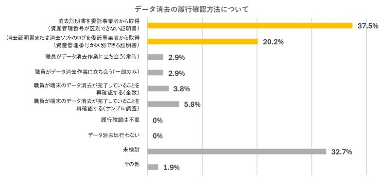 さらに、データ消去作業の履行確認についても課題が残っている。回答した教育委員会の37.5%が「1台ごとの消去ログが取れないデータ消去履行確認の実施」方法を検討中であり、資産管理番号と紐づいた証明書の取得予定も20.2%にとどまっている。文部科学省のガイドラインでは、専用ソフトウェアによる消去と消去証明書の発行が推奨されているが、現場では十分に徹底されていないのが現状である。