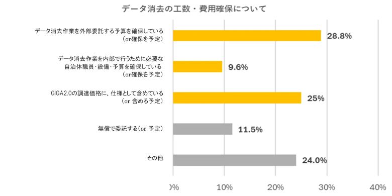 データ消去や端末処分のための外部委託予算を確保できている教育委員会は28.8%と3分の1以下にとどまっており、予算や情報不足、適切な事業者の選定が進まないことも大きな課題である。GIGA2.0調達時に処分費用を含める予定の自治体も4分の1にとどまっている。
