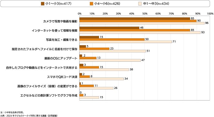 携帯電話の文字入力ができる割合は、小学生高学年および中学生で約9割に達する。パソコンでのキーボード入力ができる割合は小学生低学年で約4割、高学年で約8割、中学生で約9割が「できる」と回答した。このパソコンでの文字入力のスキルは、2020年から2021年にかけて上昇した後、以降は横ばいで推移している。