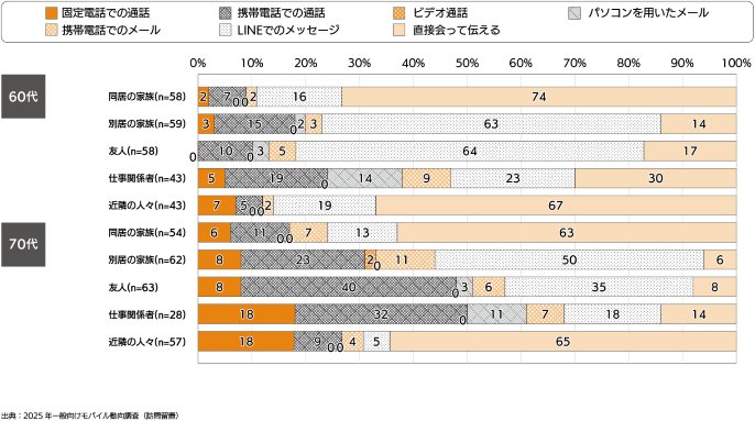シニア層の連絡手段の変化を見てみると、60代が別居家族・友人へ連絡する際には「LINEでのメッセージ」が半数を超え、70代が友人へ連絡する際には「携帯電話での通話」が最も多く利用されている。