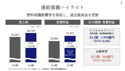 2023年3月期の連結売上高は、前期比で4.1%増の5兆6,718億円となった。連結営業利益は燃料高騰等の一時影響を吸収、過去最高益を更新し、前期比1.4%増の1兆757億円となった。親会社の所有者に帰属する利益は、前期比0.7%増の6,775億円となった。