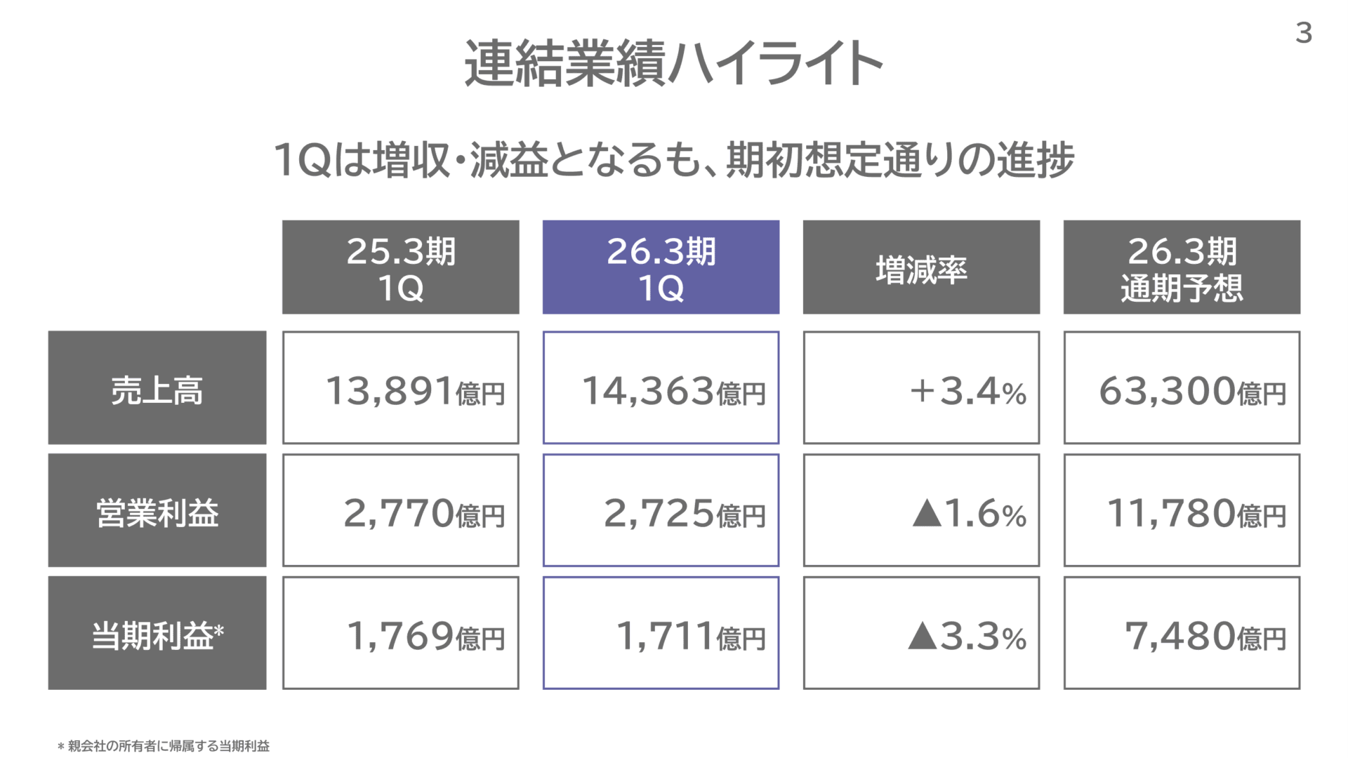 KDDI株式会社は2026年8月1日、2025年3月期第1四半期の決算を発表した。売上高1兆4,363億円(前年同期比3.4%増)、営業利益2,725億円(前年同期比1.6%減)、親会社の所有者に帰属する当期利益1,711億円(前年同期比3.3%減)と増収減益となった。減益においては、期初からの織り込み済みの一過性の損失73億円が影響した。