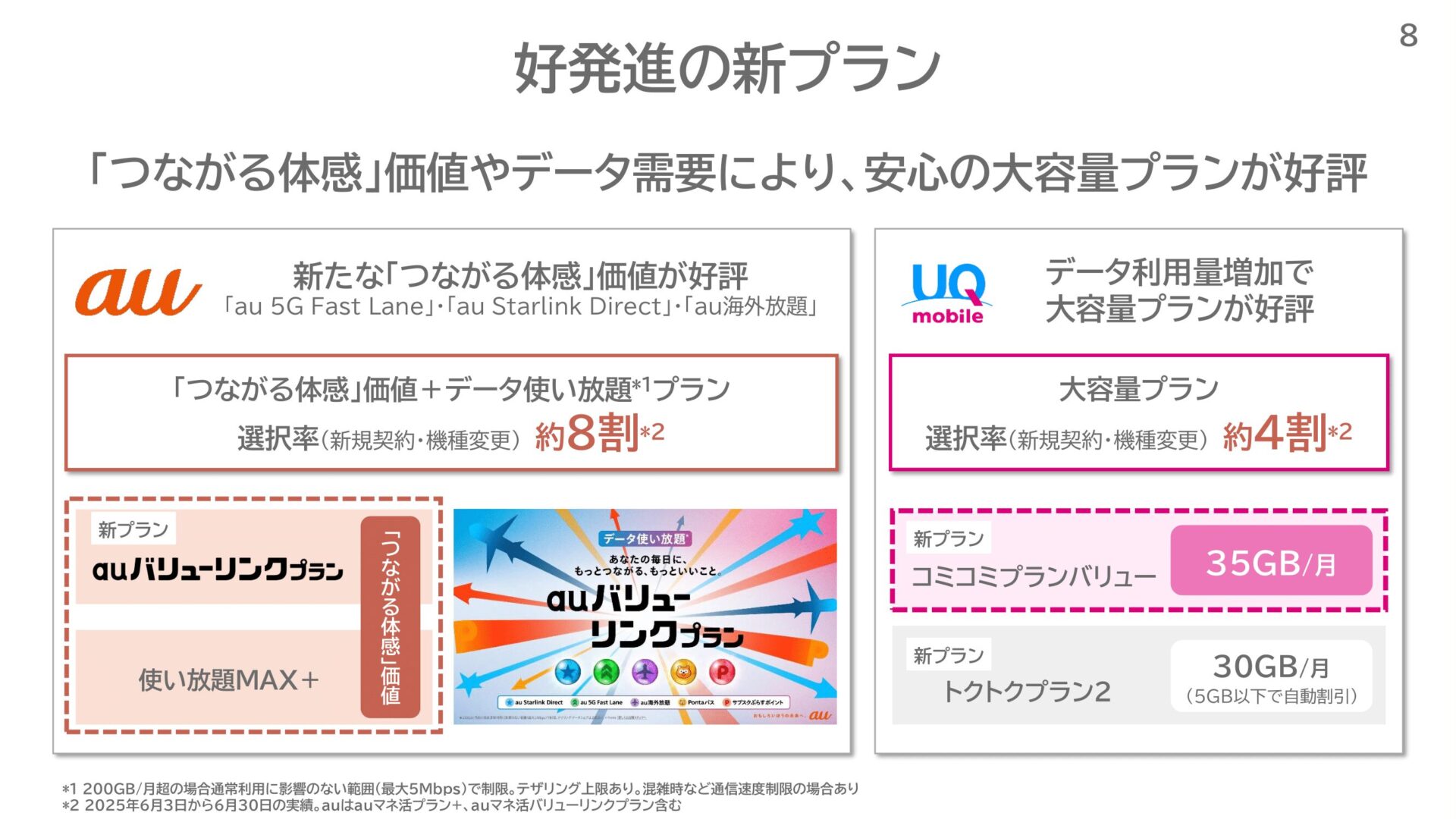 またモバイル収入の成長には新プランの好発進も要因に挙げられた。「つながる体験」価値とデータ使い放題、データ大容量プランが好評となっている。日常生活内での「つながる体験」以外にも「au Starlink Direct」により、沿岸部、山間部での通信が安心して行うできる。また「au海外放題」では海外に旅行をする顧客層に好評となっており、6月度時点で利用者の6割が通信セットプランに加入している。