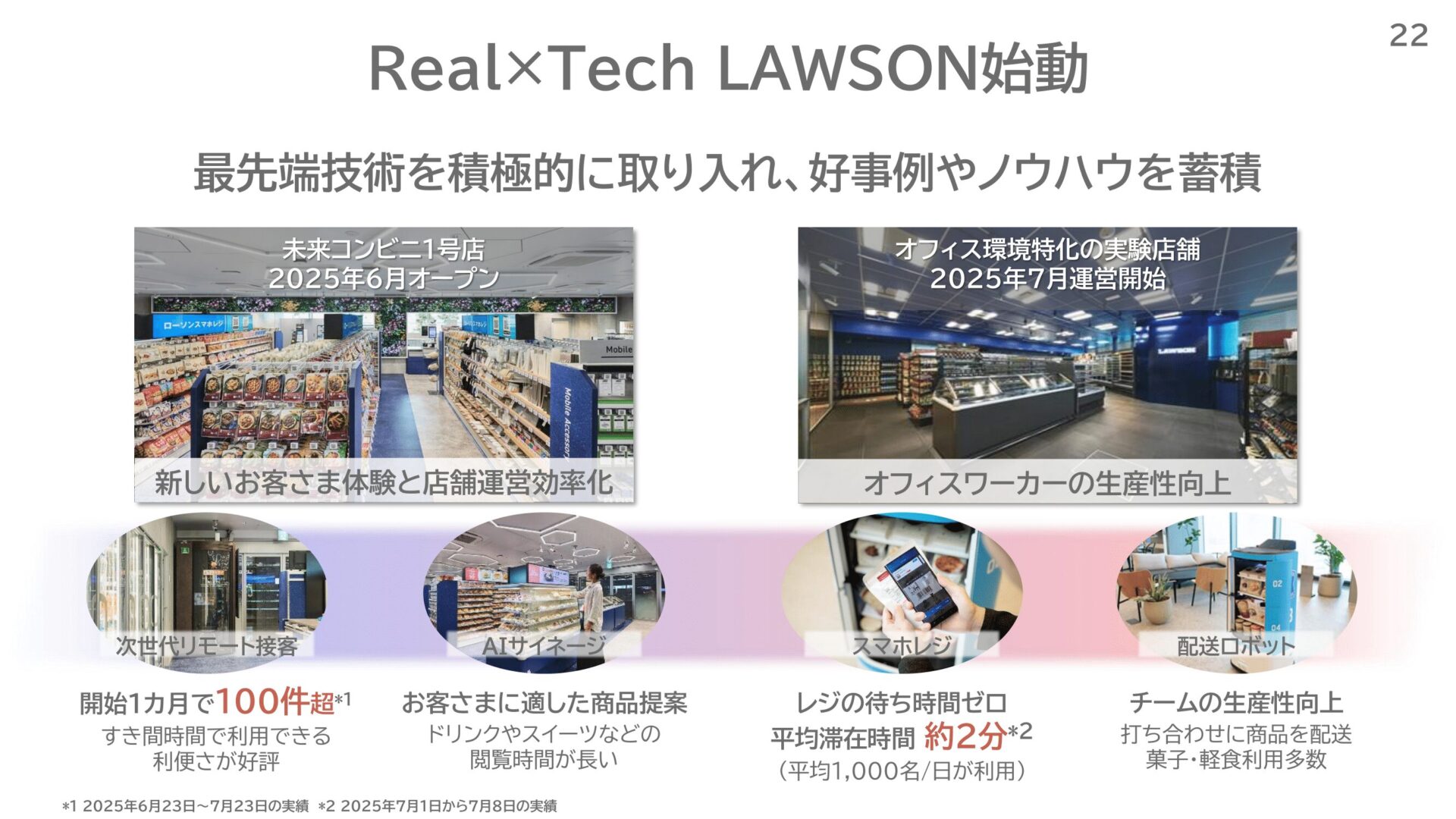 次の成長に向け「デジタルデータ×AI」を進める。高輪に「Real×Tech LAWSON」が始動し、今年6月に「未来コンビニ1号店」をオープン。7月にはオフィス環境に特化した店舗2号店もオープンした。リモート接客、スマホレジ、配送ロボットなど最先端技術を取り入れ、生産性の向上を進めている。