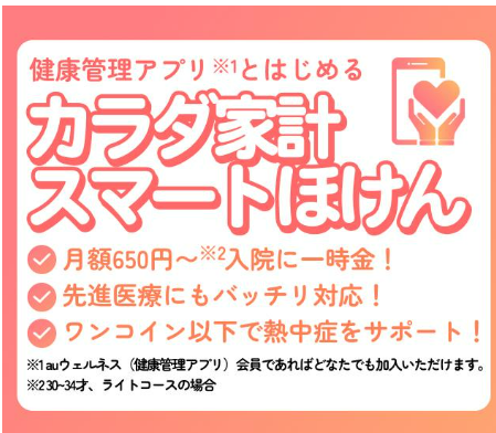 KDDIは3月29日から、健康管理アプリ「auウェルネス」会員限定の保険「カラダ家計スマートほけん (医療・傷害)」の提供を開始する。「カラダ家計スマートほけん (医療)」は、30歳から34歳のユーザーは月額650円から加入できる。日帰り入院にも対応できる入院⼀時金や、健康保険ではカバーできない先進医療への補償など、もしもの病気やけがをしてしまった場合に充実した補償を受けられるとのこと。「カラダ家計スマートほけん (傷害)」は月額240円から加入できる。運動中の熱中症や、日常生活におけるけがなど、日常の幅広い場面での補償をワンコイン以下のお手頃な保険料で提供する。