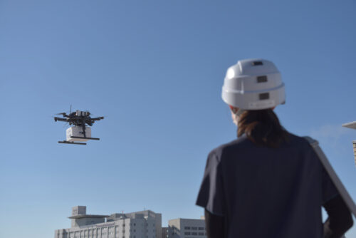 同実証は、都市部でのドローンの「有人地帯における補助者なし目視外飛行 (レベル4飛行)」による運航を想定し実施する。病院の屋上から検査機関までドローンでPCR検体を模した物資の輸送を行い、品質面や輸送効率などを検証する。