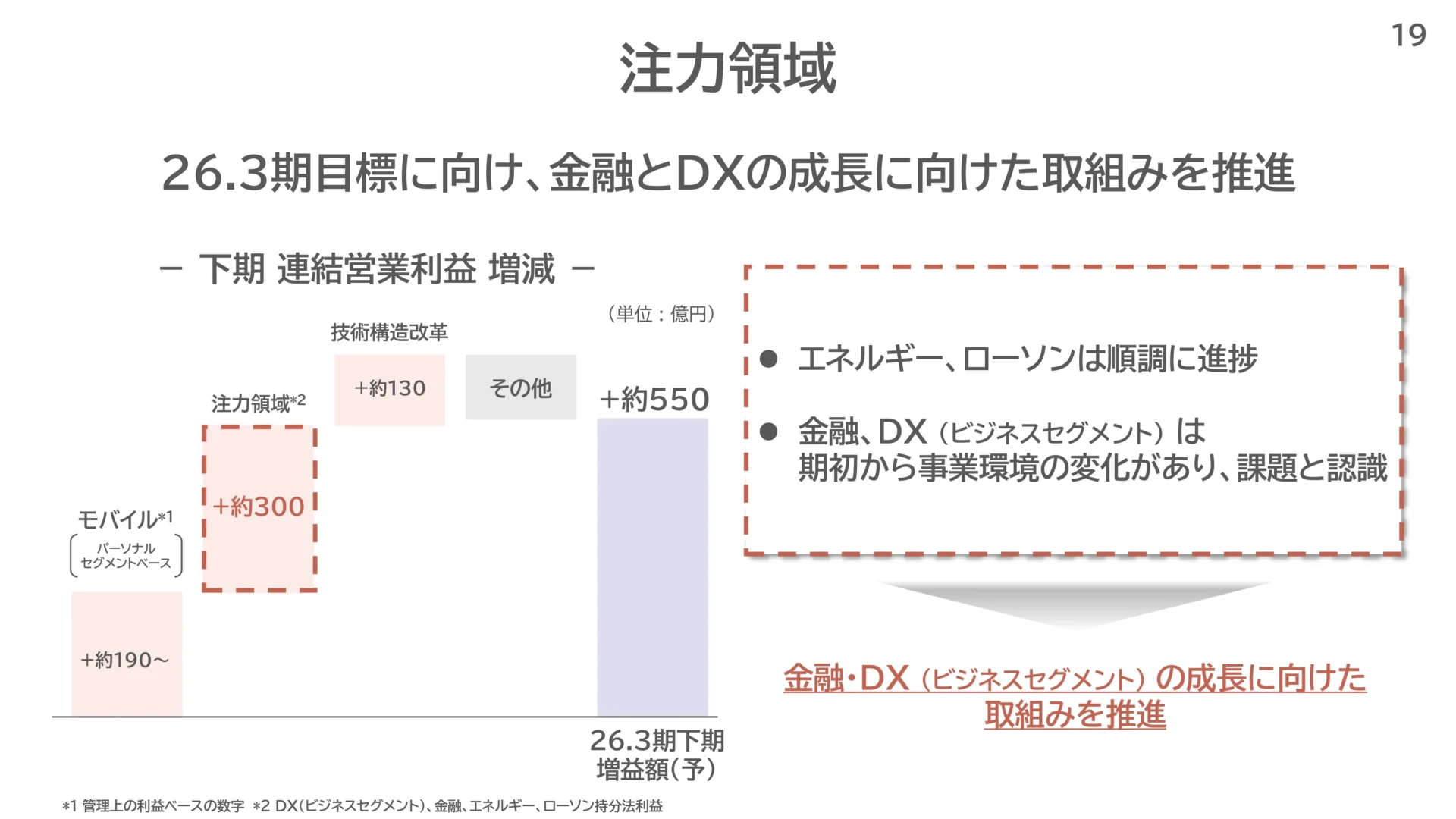 通期での目標達成に向けて金融とDXの2つのセグメントを注力領域としており、金融では「auマネ活プラン+」と「au PAYゴールドカード」との連携を高めていく狙いだ。DX(ビジネス)セグメントでは課題となっているBPO事業、SI関連事業のターンアラウンドを完了させ、大幅な増益が期待される。