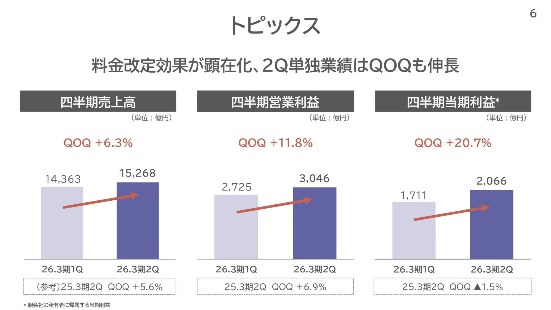 KDDI株式会社は2026年11月6日、2025年3月期第2四半期の決算を発表した。売上高1兆5,268億円(前期比6.3%増、前年同期比5.6%増)、営業利益3,046億円(前期比11.8%増、前年同期比6.9%増)、親会社の所有者に帰属する当期利益2,066億円(前期比20.7%増、前年同期比1.5%減)となった。