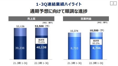 連結での売上高は、4兆138億円(前年同期比2.3%増)。営業利益は、8746億円(前年同期比0.4%増)で、通期予想に対して進捗率83.3%となった。