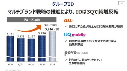 モバイル通信サービスにおいては、基盤となるグループID数はここ最近純減傾向が続いていたものの、今四半期では4.8万の純増に転換した。契約数はUQ mobileが400万超え、povoが110万超えで順調に伸びた。