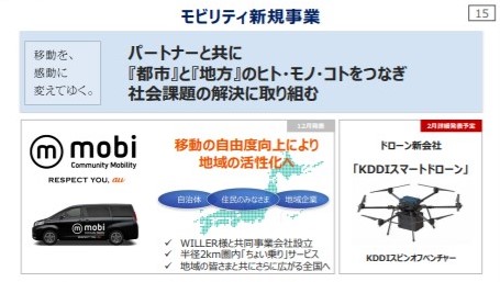 このほか、モビリティ事業や新会社「KDDIスマートドローン」の設立、コネクテッドカーへのグローバル通信プラットフォームの提供拡大などが取り上げられた。