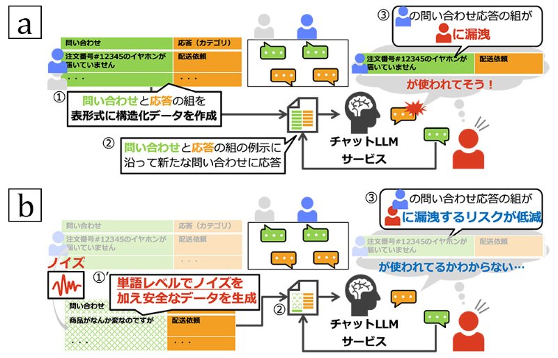 この情報漏洩リスクを低減するため、差分プライバシー(Differential Privacy; DP)DP-ICLという手法が注目されている。差分プライバシーとは、統計的処理の出力から個別のデータが識別されにくいことを定量化するプライバシー保護の強度だ。しかし、DP-ICLではノイズの影響で例題の内容が曖昧になり、LLMが正しい応答傾向を捉えにくくなるため、応答精度が大きく低下するという課題があった。