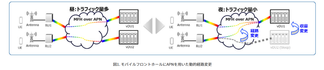 5Gの普及に伴いモバイルトラフィックが増加し、基地局や通信設備の消費電力も増大しており、6Gではさらにデータ伝送量が増え、電力効率の向上が重要な課題である。従来の固定的なRUとDUの接続方式では、トラフィックの変動に応じた柔軟な電力削減が困難であるためIOWN APNを活用し、動的経路変更によって不要なDU拠点の稼働を抑え、障害発生時の迅速な切り替えを可能にする技術が求められる状況にある。