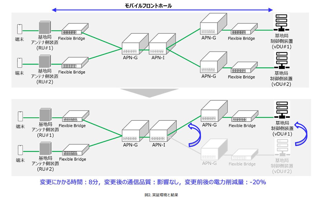 IOWN APNを活用した実証実験により、伝送距離30kmの環境で動的経路変更が8分以内で完了し、切り替え後も通信品質に影響がないことを確認した。変更した経路では一時的な中断が発生するものの、他の経路には影響がないことが判明。さらに、経路変更前後で消費電力が約20%削減した。モバイルトラフィックの変動や障害時に柔軟なDU拠点運用が可能となることが実証された。今後は実際の基地局環境での自動経路変更や時間短縮に取り組み、電力効率向上と強靭なネットワークの実現を目指す。