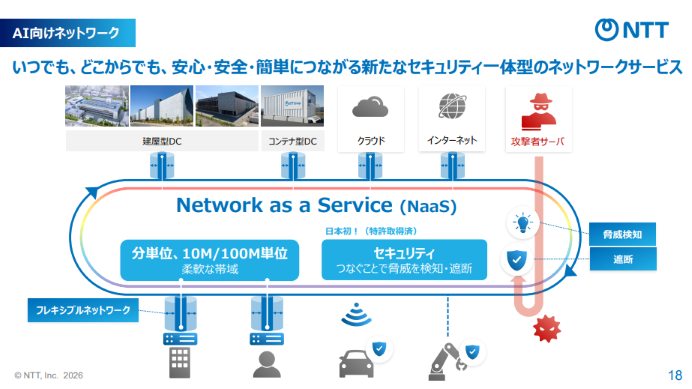 ネットワーク面でも、AI活用を前提とした構成が検討されている。データセンターやクラウドを横断するNaaS(Network as a Service)型の提供を予定しており、帯域の細かな制御やセキュリティ機能の統合を盛り込む。さらに、光電融合技術を活用したIOWN APN基盤を、2027年度までに47都道府県へ展開する計画も示された。