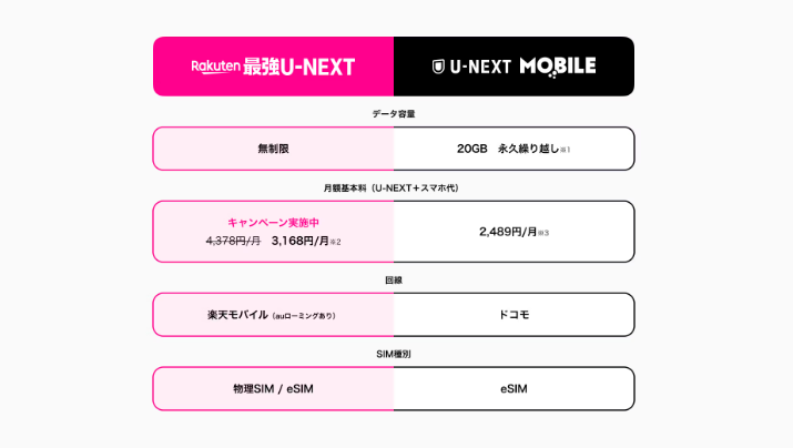 ユーザーは、データ使い放題の「Rakuten最強U-NEXT」と、20GBの「U-NEXT MOBILE」という2つのプランを、自身の利用スタイルに合わせて選択できる設計となっている。