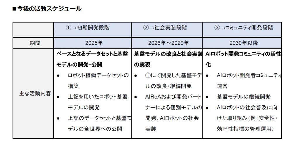 AIRoAは、まずロボット基盤モデルのためのデータ収集に取り組み、2025年中にモデルの開発と公開を目指す。将来的には、集めたデータを活用し、誰もが参加できるAIロボット開発コミュニティの発足も視野に入れている。